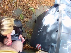 Blonde Ficke blaest Schwanz auf dem Rastplatz